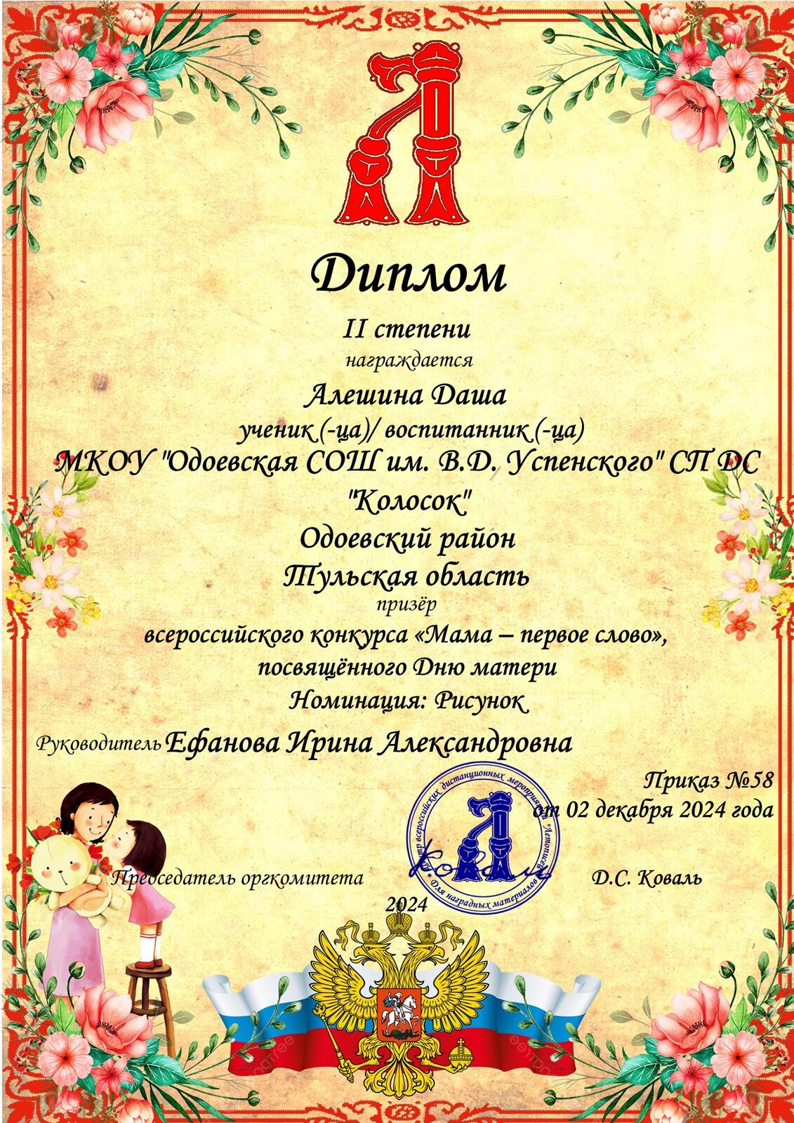 Муниципальное казенное общеобразовательное учреждение "Одоевская средняя общеобразовательная школа имени В. Д. Успенского"структурное подразделение детский сад "Колосок"