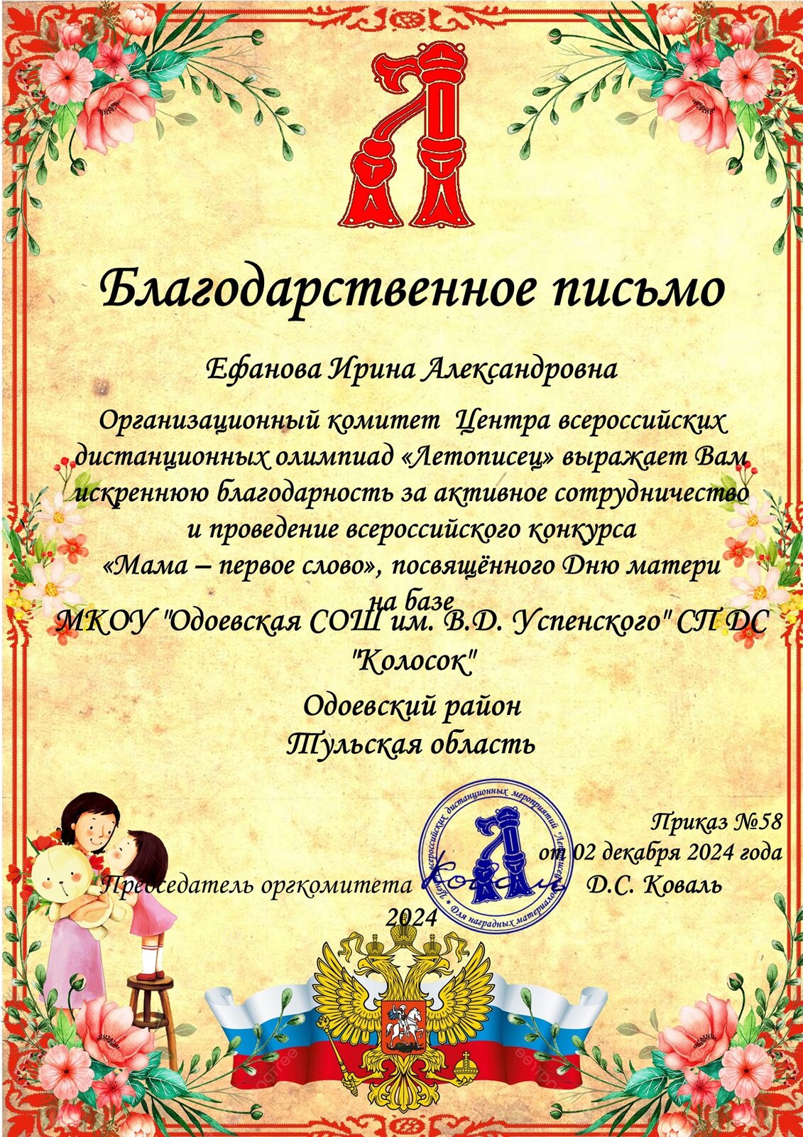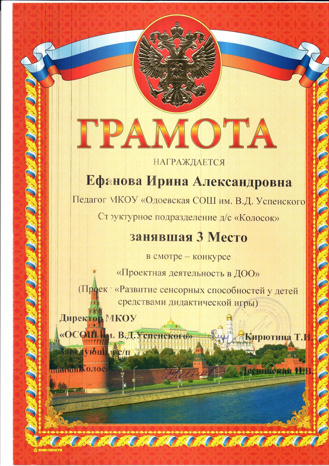 Грамота Комитета образования МО "Одоевский район" Приказ №79 от 25.09.2020г.